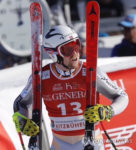 Aleksander Aamodt Kilde of Norway reacts in the finish area during the men's Super G race of the FIS Alpine Skiing World Cup event in Kitzbuehel, Austria, 24 January 2020. EPA/VALDRIN XHEMAJ