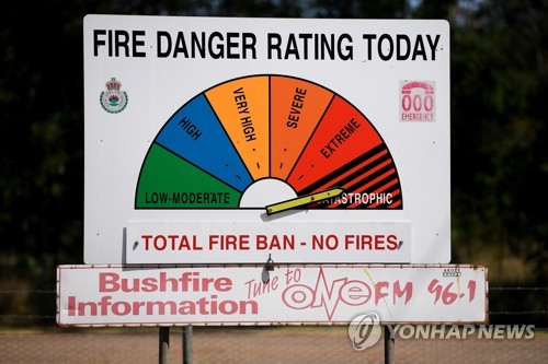 epaselect epa07989551 A bushfire danger rating sign is seen near Richmond, west of Sydney, Australia, 12 November 2019. Parts of NSW face catastrophic bushfire danger on Tuesday, with residents in bushland areas told to leave early rather than wait for fresh fires to start. EPA/DAN HIMBRECHTS AUSTRALIA AND NEW ZEALAND OUT