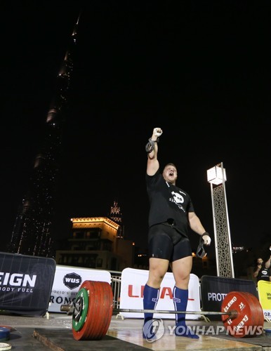Luke Stoltman of Britain reacts during the World's Ultimate Deadlift competition in Gulf emirate of Dubai, United Arab Emirates, 24 October 2019. About 20 of the strongest athlets in the world are trying to break the world record for the World's Heaviest Deadlift of 500 Kg held by English former professional strongman Eddie Hall. EPA/ALI HAIDER
