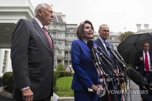 US Speaker of the House Democrat Nancy Pelosi (C), Senate Minority Leader Democrat Chuck Schumer (R), and House Majority Leader Democrat Steny Hoyer (L) deliver remarks to members of the news media outside the West Wing of the White House following a meeting between US President Donald J. Trump and Congressional leaders, in Washington, DC, USA, 16 October 2019. Trump met with Congressional leaders to discuss the US withdrawal from Syria. EPA/MICHAEL REYNOLDS