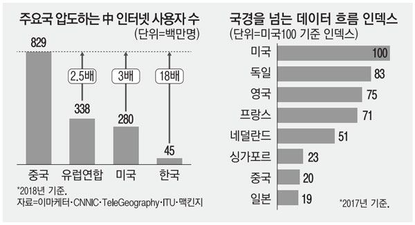 ÇÏÁö¸¸ Áß±¹ÀÇ ÀÎÅÍ³Ý »ýŰè´Â '¸¸¸®¹æÈº®(The Great Firewall)'¿¡ ½Î¿© ÀÖ´Ù. 'µðÁöÅÐÁÖ±Ç(digital sovereignty)'ÀÇ Ã¶ÇÐ ¾Æ·¡ Áß±¹ Á¤ºÎ´Â ¿Â¶óÀλ󿡼 ¹ú¾îÁö´Â ÇàÀ§¿¡ ´ëÇÑ °ü¸® °¨µ¶À» °ÈÇØ ¿Ô´Ù. ¿Ü±¹ÀÇ µðÁöÅÐ ¼ºñ½º°¡ Áß±¹¿¡¼ Á¦°øµÇÁö ¾Ê±âµµ ÇÑ´Ù. Áß±¹ÀÇ µ¥ÀÌÅÍ »ý»ê·®Àº Àü ¼¼°è ÃÖ°í ¼öÁØÀÌÁö¸¸ ±¹°æÀ» ³Ñ´Â µ¥ÀÌÅÍÀÇ 'È帧'Àº ¹Ì±¹ÀÇ 20%¿¡ ºÒ°úÇÏ°í ½Ì°¡Æ÷¸£¿Í ºñ½ÁÇÑ ¼öÁØÀÌ´Ù.