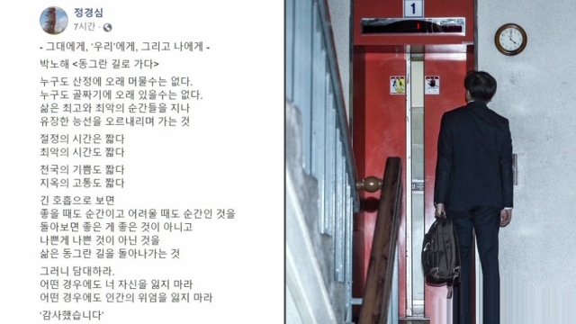 Á¶±¹ Àü ¹ý¹«ºÎ Àå°üÀÇ ºÎÀÎ Á¤°æ½É µ¿¾ç´ë ±³¼ö°¡ ¾îÁ¬¹ã(14ÀÏ) ¼Ò¼È¹Ìµð¾î¿¡ ±ÛÀ» Çϳª ¿Ã·È½À´Ï´Ù. ¹Ú³ëÇØ ½ÃÀÎÀÇ ½Ã¸¦ ÀοëÇØ °£Á¢ÀûÀ¸·Î ½É°æÀ» ¹àÇû½À´Ï´Ù. Á¶ Àü Àå°üÀÌ »çÅð Àǻ縦 ¹àÈù ¾îÁ¦ ³· Á¤ ±³¼ö´Â °ËÂû¿¡ ´Ù¼¸ ¹øÂ° ¼ÒȯµÅ Á¶»ç¸¦ ¹Þ°í ÀÖ¾ú´Âµ¥ °Ç° »óÀÇ ÀÌÀ¯·Î ¼ö»ç Áß´ÜÀ» ¿äûÇÑ µÚ °ð¹Ù·Î º´¿øÀ¸·Î °¬½À´Ï´Ù.