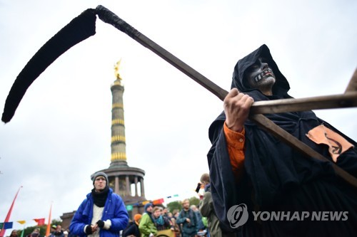 An activist of the global environment movement Extinction Rebellion (XR) is dressed as the death as they block the traffic junction 'Grosser Stern' around the victory column in Berlin, Germany, 08 October 2019. The global environmental movement Extinction Rebellion announced announced climate change protests and blockades that take place in the German capital starting 07 October. EPA/CLEMENS BILAN