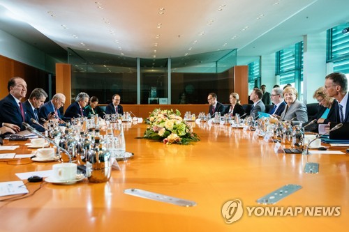 President of the World Bank David Malpass (L), Secretary-General of the World Trade Organization (WTO) Roberto Azevedo (2-L), Secretary-General of the Organisation for Economic Co-operation and Development (OECD) Angel Gurr?a (3-L), Managing Director of the International Monetary Fund (IMF) David Lipton (4-L) and German Chancellor Angela Merkel (3-R) sit during a conversation with the chairmen of international economic and financial organizations at the German chancellery in Berlin, Germany, 01 October 2019. EPA/HAYOUNG JEON