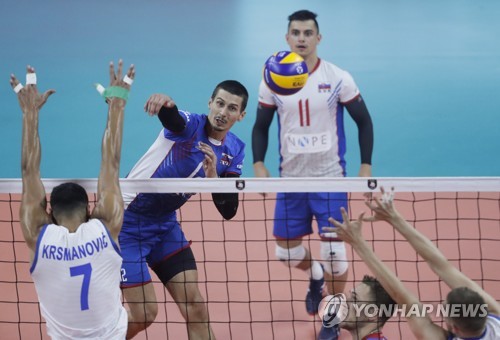 Matej Patak of Slovakia (bk) in action against Petar Krsmanovic of Serbia during the EuroVolley Men 2019 match between Slovakia and Serbia in Antwerp, Belgium, 15 September 2019. EPA/OLIVIER HOSLET