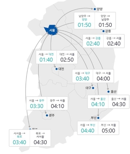 ¿ï»ê¿¡¼ ¼¿ïÀº 4½Ã°£ 30ºÐ, ±¤ÁÖ¿¡¼´Â 4½Ã°£ 10ºÐ, ´ë±¸¿¡¼´Â 4½Ã°£, ´ëÀü¿¡¼´Â 2½Ã°£ 50ºÐ, °¸ª¿¡¼´Â 2½Ã°£ 40ºÐÀÌ ¼Ò¿äµÉ °ÍÀ¸·Î º¸ÀδÙ.