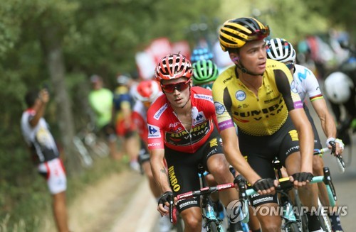 Slovenian rider Primoz Roglic of Team Jumbo-Visma wears the overall leader's red jersey during the 18th stage of the Vuelta a Espana cycling race over 177.5km from Colmenar Viejo to Becerril de la Sierra, at the Morcuera mountain pass, near Madrid, Spain, 12 September 2019. EPA/JAVIER LIZON