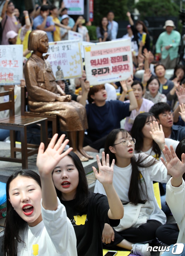 (¼¿ï=´º½º1) ¿À´ëÀÏ ±âÀÚ = 11ÀÏ ¼¿ï Á¾·Î±¸ ¿¾ ÁÖÇÑ ÀϺ»´ë»ç°ü ¾Õ¿¡¼ ¿¸° ÀϺ»±º À§¾ÈºÎ ¹®Á¦ ÇØ°áÀ» À§ÇÑ Á¦1404Â÷ Á¤±â ¼ö¿ä½ÃÀ§¿¡¼ Âü°¡ÀÚµéÀÌ ÀϺ»´ë»ç°üÀ» ÇâÇØ °ø½Ä »çÁË¿Í ¹è»óÀ» Ã˱¸ÇÏ´Â ±¸È£¸¦ ¿ÜÄ¡°í ÀÖ´Ù. 2019.9.11/´º½º1
