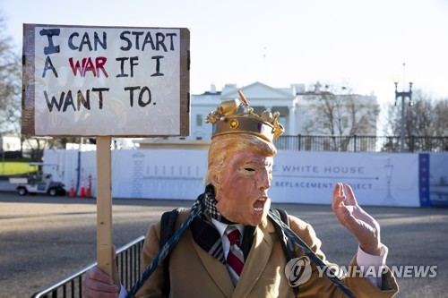 A person wears a mask while holding a sign during a rally held to voice opposition to US conflict with Iran, across the street from the White House in Washington, DC, USA, 08 January 2020. US President Trump made a statement earlier in the day, 08 January, announcing new sanctions against Iran after Iran launched missile strikes against two military bases in Iraq that house US forces. The strikes were done in retaliation to the killing of Iranian Revolutionary Guards Corps Lieutenant general and commander of the Quds Force, Qasem Soleimani, by a US drone strike in Baghdad. EPA/MICHAEL REYNOLDS