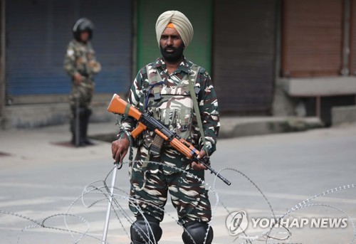 Indian paramilitary soldiers stand guard during a shutdown in Srinagar, Kashmir, India, 06 September 2019. Police and paramilitary troopers remain deployed on roads in Srinagar and other towns after the government of India abrogated Article 370 of its constitution, that bifurcated the region into two Union Territories. EPA/FAROOQ KHAN