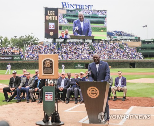 Former Chicago Cubs closing pitcher Lee Smith speaks during ceremonies honoring his induction into the Baseball Hall of Fame before the start of the MLB game between the Milwaukee Brewers and the Chicago Cubs at Wrigley Field in Chicago, Illinois, USA, 01 September 2019. EPA/TANNEN MAURY