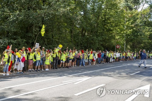 Protesters from the 'Gilets Jaunes' (Yellow Vests) movement hold hands standing on the road during a demonstration, in Geneva, Switzerland, 31 August 2019. EPA/SALVATORE DI NOLFI