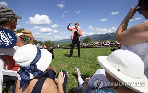 epaselect epa07773780 Democratic candidate for United States President Senator Elizabeth Warren addresses a crowd during a town hall style meeting at Toads Hill Farm in Franconia, New Hampshire, USA 14 August 2019. EPA/CJ GUNTHER