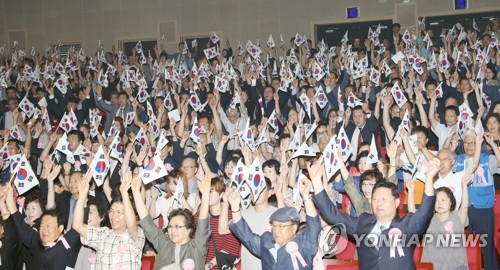 ÅÂ±Ø±â ÆÞ·°À̸ç2018³â 8¿ù 15ÀÏ ¿ï»ê¹®È¿¹¼úȸ°ü¿¡¼ ¿¸° 73Áֳ⠱¤º¹Àý °æÃà½Ä¿¡¼ Âü¼®ÇÑ ½Ã¹ÎµéÀÌ ´ÙÇÔ²² űر⸦ Èçµé°í ÀÖ´Ù.