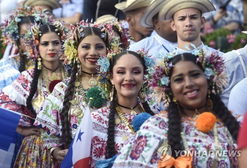 Wearing traditional costumes, dancers from Panama march during the 26th Summerfest International Folklore Festival and Folk Art Fair in Szazhalombatta, Hungary, August 14, 2019. The festival held between August 12 and 22 is attended by representatives of 16 countries of the world. EPA/Noemi Bruzak HUNGARY OUT