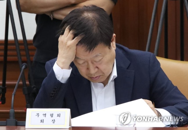 (¼¿ï=¿¬ÇÕ´º½º) ±è½ÂµÎ ±âÀÚ = ±è¿µÁÖ Çѱ¹¹«¿ªÇùȸ ȸÀåÀÌ 14ÀÏ ¿ÀÀü Á¤ºÎ¼¿ïû»ç¿¡¼ ¿¸° Á¦21Â÷ °æÁ¦È°·Â´ëåȸÀÇ¿¡ Âü¼®ÇØ ¸Ó¸®¿¡ ¼ÕÀ» ¾ñ°í º¸°í¼¸¦ Àаí ÀÖ´Ù. 2019.8.14