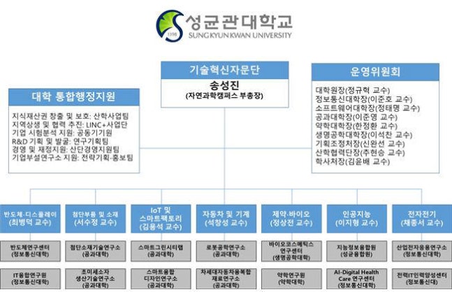 ±â¼úÇõ½ÅÀÚ¹®´ÜÀº ÀÚ¿¬°úÇÐÄ·ÆÛ½º ¼Û¼ºÁø ºÎÃÑÀå(±â°è°øÇкÎ)À» ´ÜÀåÀ¸·Î ÇØ ¼º±Õ°ü´ë ³» ±â¾÷Çõ½Å¼ºÀåÁö¿ø¼¾ÅÍ¿Í Áö¿ª»ó»ý¹ßÀüÃËÁø¼¾Å͸¦ Áß½ÉÀ¸·Î ¿î¿µµÈ´Ù. ¡â¹ÝµµÃ¼/µð½ºÇ÷¹ÀÌ(ÃÖº´´ö ±³¼ö) ¡â÷´ÜºÎǰ ¹× ¼ÒÀç(¼¼öÁ¤ ±³¼ö) ¡â»ç¹°ÀÎÅͳÝ(IoT) ¹× ½º¸¶Æ®ÆÑÅ丮(±è¿ë¼® ±³¼ö) ¡âÀÚµ¿Â÷ ¹× ±â°è(¼®Ã¢¼º ±³¼ö) ¡âÁ¦¾à¹ÙÀÌ¿À(Á¤»óÀü ±³¼ö) ¡âÀΰøÁö´É(ÀÌÁöÇü ±³¼ö) ¡âÀüÀÚÀü±â(äÁ¾¼ ±³¼ö) µî ÃÑ 7°³ ºÐ¾ß¿¡ Àü´ã ±³¼ö¸¦ µÐ´Ù. »êÇÏ ¼¾ÅÍ¿Í ¿¬±¸¼Ò µî¿¡¼ ¾Ö·Î±â¼ú µî¿¡ ´ëÇÑ Á÷Á¢ Áö¿øÀ» ÇÑ´Ù.