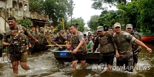 A handout photo made available by Indian Defense Ministry shows Indian military personnel conducting rescue operations in the flood affected areas in Belgaum/Belagavi district in North Karnataka, India, 10 August 2019. Over 80 have been killed in Kerala and Karnataka in flood-related incidents. Heavy rainfall has affected various parts of Kerala and northern Karnataka, and Kerala State Disaster Management Authority (KDSMA) evacuated 235000 people and moved them to 315 camps across the state in view of the heavy rains. EPA/INDIAN DEFENSE MINISTRY HANDOUT HANDOUT EDITORIAL USE ONLY/NO SALES EPA-EFE/INDIA INDIAN DEFENSE MINISTRY PRO HANDOUTS HANDOUT EDITORIAL USE ONLY/NO SALES