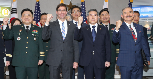 Á¤°æµÎ ±¹¹æºÎ Àå°ü°ú ¸¶Å© ¿¡½ºÆÛ ½ÅÀÓ ¹Ì±¹ ±¹¹æºÎ Àå°üÀÌ 9ÀÏ ¿ÀÀü ¼¿ï ¿ë»ê±¸ ±¹¹æºÎ¿¡¼ ¿¸° Çѹ̱¹¹æÀå°üȸ´ãÀ» ¾ÕµÎ°í ±â³äÃÔ¿µÀ» Çϰí ÀÖ´Ù. »çÁø ¾ÕÁÙ ¿ÞÂʺÎÅÍ ¹ÚÇѱâ ÇÕÂüÀÇÀå, Á¤°æµÎ ±¹¹æºÎ Àå°ü, ¸¶Å© ¿¡½ºÆÛ ½ÅÀÓ ¹Ì±¹ ±¹¹æÀå°ü, ÇØ¸® ÇØ¸®½º ÁÖÇÑ ¹Ì±¹´ë»ç./¿¬ÇÕ´º½º¸¶Å© ¿¡½ºÆÛ ¹Ì±¹ ½ÅÀÓ ±¹¹æÀå°üÀº 9ÀÏ "Çѹ̵¿¸ÍÀº Çѹݵµ ¹× µ¿ºÏ¾ÆÀÇ ÆòÈ¿Í ¾Èº¸ÀÇ ÇÙ½ÉÃà(linch pin)"À̶ó°í ¸»Çß´Ù. ±×·¯¸é¼ "ºÏÇÑÀÌ ÇѹݵµÀÇ '¿ÏÀüÇÏ°í °ËÁõ°¡´ÉÇÏ¸ç ºÒ°¡¿ªÀûÀÎ ºñÇÙÈ(CVID)'¿¡ Âü¿©Çϱâ Àü±îÁö À¯¿£ ¾ÈÀüº¸ÀåÀÌ»çȸ Á¦À縦 ´ÜÈ£ÇÏ°Ô ÁýÇàÇÒ °Í"À̶ó°í Çß´Ù.