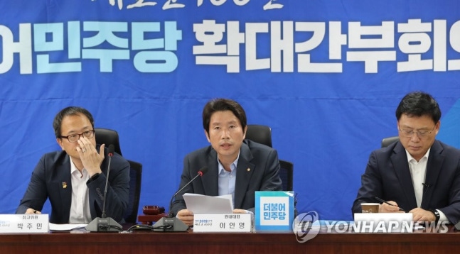(¼­¿ï=¿¬ÇÕ´º½º) ÇÏ»çÇå ±âÀÚ = ´õºÒ¾î¹ÎÁÖ´ç ÀÌÀοµ ¿ø³»´ëÇ¥°¡ 9ÀÏ ¿ÀÀü ±¹È¸ ÀÇ¿øÈ¸°ü¿¡¼­ ¿­¸° È®´ë°£ºÎȸÀÇ¿¡¼­ ¹ß¾ðÇϰí ÀÖ´Ù. 2019.8.9