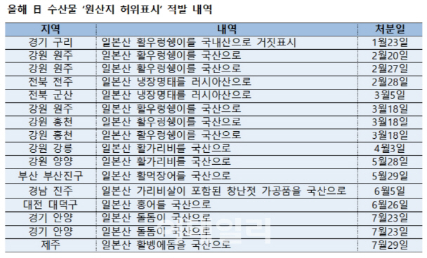 | | ÀϺ»»ê ¼ö»ê¹°ÀÇ ¿ø»êÁö¸¦ ÇãÀ§·Î Ç¥½ÃÇØ ÆÇ¸ÅÇß´Ù°¡ ¿ÃÇØ 1~7¿ù¿¡ Àû¹ßµÈ À½½ÄÁ¡ ¸í´ÜÀÌ´Ù. ¡®³ó¼ö»ê¹°ÀÇ ¿ø»êÁö Ç¥½Ã¿¡ °üÇÑ ¹ý·ü(9Á¶)¡¯¿¡ µû¶ó 2ȸ ÀÌ»ó ¿ø»êÁö¸¦ Ç¥½ÃÇÏÁö ¾Ê°Å³ª ÇãÀ§·Î Ç¥½ÃÇÑ À½½ÄÁ¡Àº 1³â°£ ±¹¸³¼ö»ê¹°Ç°Áú°ü¸®¿ø ȨÆäÀÌÁö¿¡ »óÈ£¸íÀÌ °øÇ¥µÈ´Ù.[Ãâó=±¹¸³¼ö»ê¹°Ç°Áú°ü¸®¿ø] |