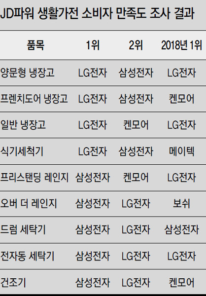 À̹ø Á¶»ç¿¡¼ »ï¼ºÀüÀÚ´Â °ÇÁ¶±â¸¦ ºñ·ÔÇØ µå·³¼¼Å¹±â, ÀüÀÚµ¿¼¼Å¹±â, ÇÁ¸®½ºÅĵù ·¹ÀÎÁö(Äîž¡¤¿Àºì º¹ÇÕÁ¦Ç°), ÀüÀÚ·¹ÀÎÁö µî 5°³ ºÎ¹®¿¡¼ 1À§¿¡ ¿Ã¶ú´Ù. »ï¼ºÀüÀÚ´Â Áö³ÇØ¿¡´Â µå·³¼¼Å¹±â¿¡¼¸¸ 1À§¿¡ ¿Ã¶úÀ¸³ª ¿ÃÇØ´Â ´Ù¸¥ Á¦Ç° ºÐ¾ß¿¡¼µµ ¸¸Á·µµ°¡ ±Þ¼ºÀåÇØ Áö³ÇØ ÃÖ´Ù 1À§¿´´ø LGÀüÀÚ¸¦ Á¦ÃÆ´Ù.