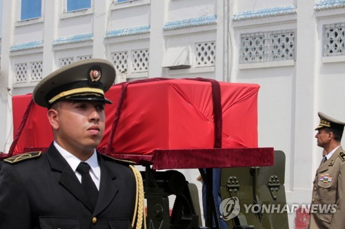 Military officers stand next to the coffin of late Tunisian President Beji Caid Essebsi during his state funeral in Tunis, Tunisia, 27 July 2019. Essebsi, who led the country's transition to democracy following the Arab Spring protests in 2011, died on 25 July at the age of 92. EPA/AMEL PAIN