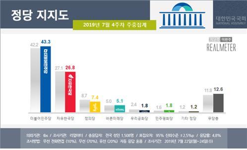(¸®¾ó¹ÌÅÍ Á¦°ø)© ´º½º1¿©´çÀÎ ¹ÎÁÖ´çÀÇ ÁöÁöÀ²µµ »ó½ÂÇß´Ù. ¹ÎÁÖ´çÀº Áö³ÁÖº¸´Ù 1.1%p ¿À¸¥ 43.3%ÀÇ ÁöÁöÀ²À» ±â·ÏÇß´Ù. ÀÌ ¿ª½Ã ÀÛ³â 10¿ù 2ÁÖÂ÷(44.8%) ÀÌÈÄ 9°³¿ù¿© ¸¸ÀÇ ÃÖ°íÄ¡´Ù. ¹ÎÁÖ´çÀº º¸¼öÃþ°ú Áøº¸Ãþ, ÃæÃ»±Ç, ¼¿ï°ú °æ±â¡¤ÀÎõ, PK(ºÎ»ê¡¤¿ï»ê¡¤°æ³²), 40´ë¿Í 30´ë¸¦ Áß½ÉÀ¸·Î »ó½ÂÇß´Ù.