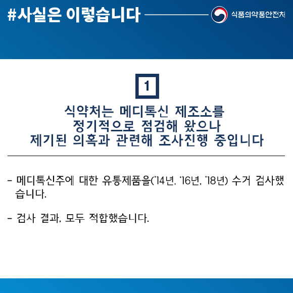 ¡Ø ¸ÞµðÅ彺 Á¦Á¶¼Ò¿¡ ´ëÇØ Á¤±âÀûÀ¸·Î Á¡°ËÇϰí ÀÖÀ¸¸ç, ¸ÞµðÅå½ÅÁÖ¿¡ ´ëÇÑ À¯ÅëÁ¦Ç° ¼ö°Å°Ë»ç(¡¯14³â, ¡¯16³â, ¡¯18³â) °á°ú ¸ðµÎ ÀûÇÕÇÏ¿´À½
