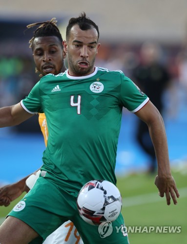 Djamel Benlamri of Algeria challenged by Wilfried Zaha (L) of Ivory Coast during the 2019 Africa Cup of Nations quarterfinal match between Ivory Coast and Algeria at Suez Stadium, Suez, Egypt on 11 July 2019. EPA/SAMUEL SHIVAMBU