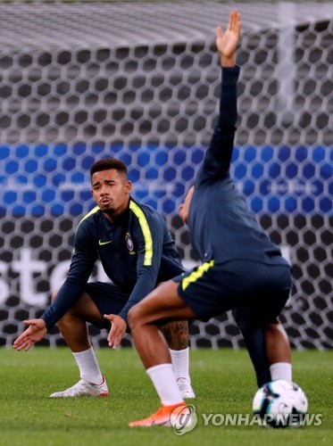 Brazil's national soccer team training player Gabriel Jesus (L) attends a training session at Arena Corinthians stadium in Sao Paulo, Brazil, 21 June 2019. EPA/Paulo Whitaker