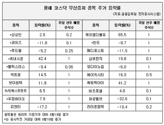 ¹«»óÁõÀÚ °áÁ¤À» °ø½ÃÇßÁö¸¸ ¾ÆÁ÷ ±Ç¸®¶ôÀÌ ½Ç½ÃµÇÁö ¾ÊÀº 7°³»ç Áß °ø½Ã Á÷Àü °Å·¡ÀÏ ´ëºñ »ó½ÂÇÑ Á¾¸ñÀº 3°³»ç·Î ³ªÅ¸³µ´Ù. È޳׽ÿÂ(42.4%)ÀÇ »ó½Â·üÀÌ °¡Àå ³ô¾Ò°í, ¿ìÁ¤¹ÙÀÌ¿À(7.9%)°¡ µÚ¸¦ À̾ú´Ù. °¡Àå ÃÖ±ÙÀÎ Áö³ 17ÀÏ ¹«»óÁõÀÚ¸¦ °ø½ÃÇÑ »ó»óÀεµ 2.8% ¿Ã¶ú´Ù. ¹Ý¸é ÄÚÀÌÁî(-11.8%), Ç︯½º¹Ì½º(-9.4%) µîÀº ³»·È´Ù.