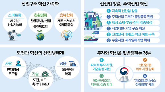 »ê¾÷±¸Á¶ Çõ½ÅÀ» °¡¼ÓÈÇϰí, ½Å»ê¾÷À» »õ·Î¿î Áַ»ê¾÷À¸·Î À°¼ºÇÏ´Â ÇÑÆí, ±âÁ¸ Áַ»ê¾÷Àº Çõ½ÅÀ» ÅëÇØ Å»¹Ù²ÞÇÑ´Ù´Â Àü·«ÀÌ´Ù. ¶Ç »ê¾÷»ýŰ踦 µµÀü°ú ÃàÀû Áß½ÉÀ¸·Î Àü¸é °³ÆíÇϰí, ÅõÀÚ¿Í Çõ½ÅÀ» µÞ¹ÞħÇÑ´Ù´Â Á¤ºÎ ¿ªÇÒÀ» °ÈÇϱâ·Î Çß´Ù.