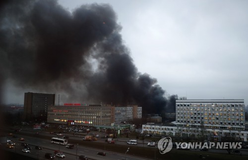A huge cloud of black smoke raises from a burning warehouse in the southern outskirts of Moscow, Russia, 13 December 2019. The flames have spread over some 7,000 square meters of the textile warehouse, authorities said, while two helicopters are helping to fight the blaze. There were no immediate reports of any casualties, but one firefighter was injured and 25 ambulance cars and a special air testing vehicle wre at the site, media reported. EPA/MAXIM SHIPENKOV