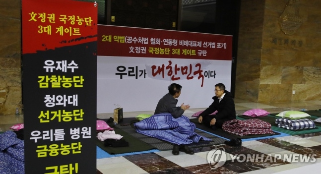 (¼¿ï=¿¬ÇÕ´º½º) Áø¼ºÃ¶ ±âÀÚ = 12ÀÏ ¿ÀÀü ±¹È¸ º»È¸ÀÇÀå ¾Õ ·ÎÅÙ´õȦ¿¡¼ ¹«±âÇÑ ³ó¼º ÀÌÆ²Â°¸¦ ¸ÂÀº ÀÚÀ¯Çѱ¹´ç Ȳ±³¾È ´ëÇ¥(¿À¸¥ÂÊ)°¡ ±è¼ºÅ ÀÇ¿ø°ú À̾߱⸦ ³ª´©°í ÀÖ´Ù. 2019.12.12