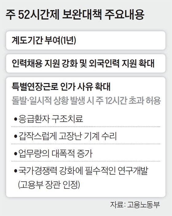 ÁÖ 52½Ã°£Á¦ º¸¿Ï´ëÃ¥ ÁÖ¿ä³»¿ë ÀÌ Àå°üÀº ¢ºÀÎ¸í º¸È£¿Í ¾ÈÀü È®º¸, ½Ã¼³¡¤¼³ºñÀÇ Àå¾Ö¡¤°íÀå µî¿¡ ´ëÇÑ ±ä±Þ ´ëó ¢ºÅë»óÀûÀÌÁö ¾ÊÀº ¾÷¹«·®ÀÇ ´ëÆø Áõ°¡ ¢º°í¿ëºÎ°¡ ±¹°¡ °æÀï·Â °È¿Í ±¹¹Î °æÁ¦ ¹ßÀüÀ» À§ÇØ ÇÊ¿äÇÏ´Ù°í ÀÎÁ¤ÇÏ´Â ¿¬±¸°³¹ß µîÀ¸·Î Àΰ¡ »çÀ¯¸¦ È®´ëÇÑ´Ù°í ¼³¸íÇß´Ù. ³»³âºÎÅÍ Æ¯º°¿¬Àå±Ù·Î¸¦ Àΰ¡¹ÞÀ» ¼ö ÀÖ´Â »çÀ¯ÀÇ ´ëÇ¥Àû ¿¹½Ã·Î´Â ¢ºÀÀ±ÞȯÀÚ ±¸Á¶³ª Ä¡·á ¢º°©ÀÛ½º·¹ °íÀå ³ ±â°èÀÇ ¼ö¸® ¢º´ë·® ¸®ÄÝ»çÅ ¢º¿øÃ»ÀÇ °©ÀÛ½º·¯¿î ÁÖ¹®À¸·Î Ã˹ÚÇÑ ³³±â¸¦ ¸ÂÃß±â À§ÇØ ÀϽÃÀû ¿¬Àå±Ù·Î Ãʰú°¡ ºÒ°¡ÇÇÇÑ °æ¿ì µîÀ» µé¾ú´Ù.