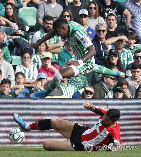 Real Betis Brazilian Emerson (up) vies for the ball with Athletic Bilbao's defender Unai Nunez (down) during their LaLiga game at Benito Villamarin Stadium in Seville, southern Spain, 08 December 2019. EPA/Jose Manuel Vidal
