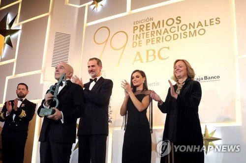 Writer Gabriel Albiac (L) receives the 'Mariano de Cavia' award from Spain's King Felipe VI (C) and Queen Letizia (2-R) at the 99th 'Mariano de Cavia', 'Luca de Tena' and 'Mingote' ABC Journalism Award ceremony in Madrid, Spain, 03 December 2019. EPA/JUANJO MARTIN / POOL