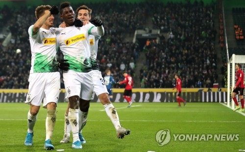 Moenchengladbach's Breel Embolo (C) celebrates scoring the fourth goal with Moenchengladbach's Florian Neuhaus (R) and Moenchengladbach's Patrick Herrmann (L) during the German Bundesliga soccer match between Borussia Moenchengladbach and SC Freiburg in Moenchengladbach, Germany, 01 December 2019. EPA/FRIEDEMANN VOGEL CONDITIONS - ATTENTION: The DFL regulations prohibit any use of photographs as image sequences and/or quasi-video.